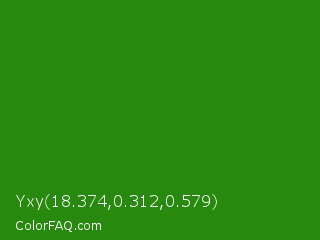 Yxy 18.374,0.312,0.579 Color is a dark green color and the nearest color is Slimy Green #299617. Hex code #28890f and RGB value is rgb(40,137,15). In RGB color space, this color is composed of 16% red, 54% green, 6% blue, In CMYK color space, this color is composed of 71% cyan, 0% magenta, 89% yellow , 46% black , In HSL color space, this color has a hue angle of 108° , 80% saturation and 30% lightness.
