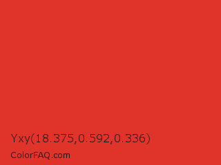 Yxy 18.375,0.592,0.336 Color is a normal red color and the nearest color is Permanent Geranium Lake #e12c2c. Hex code #e03329 and RGB value is rgb(224,51,41). In RGB color space, this color is composed of 88% red, 20% green, 16% blue, In CMYK color space, this color is composed of 0% cyan, 77% magenta, 82% yellow , 12% black , In HSL color space, this color has a hue angle of 3° , 75% saturation and 52% lightness.
