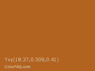 Yxy 18.37,0.509,0.41 Color is a normal orange color and the nearest color is Desert #ae6020. Hex code #b1631f and RGB value is rgb(177,99,31). In RGB color space, this color is composed of 69% red, 39% green, 12% blue, In CMYK color space, this color is composed of 0% cyan, 44% magenta, 82% yellow , 31% black , In HSL color space, this color has a hue angle of 28° , 70% saturation and 41% lightness.