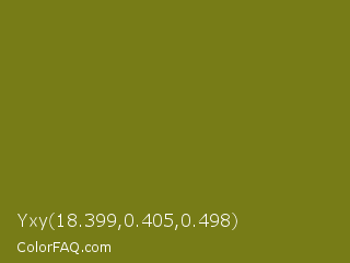 Yxy 18.399,0.405,0.498 Color is a dark yellow color and the nearest color is Pacifika #778120. Hex code #777c17 and RGB value is rgb(119,124,23). In RGB color space, this color is composed of 47% red, 49% green, 9% blue, In CMYK color space, this color is composed of 4% cyan, 0% magenta, 81% yellow , 51% black , In HSL color space, this color has a hue angle of 63° , 69% saturation and 29% lightness.