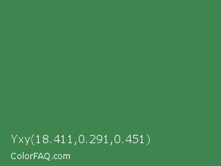 Yxy 18.411,0.291,0.451 Color is a normal green color and the nearest color is Goblin #3d7d52. Hex code #3f8550 and RGB value is rgb(63,133,80). In RGB color space, this color is composed of 25% red, 52% green, 31% blue, In CMYK color space, this color is composed of 53% cyan, 0% magenta, 40% yellow , 48% black , In HSL color space, this color has a hue angle of 135° , 36% saturation and 38% lightness.