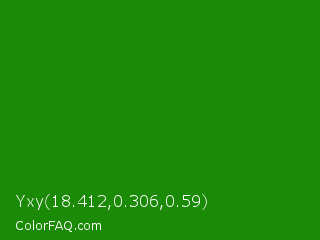 Yxy 18.412,0.306,0.59 Color is a dark green color and the nearest color is India Green #138808. Hex code #1a8a07 and RGB value is rgb(26,138,7). In RGB color space, this color is composed of 10% red, 54% green, 3% blue, In CMYK color space, this color is composed of 81% cyan, 0% magenta, 95% yellow , 46% black , In HSL color space, this color has a hue angle of 111° , 90% saturation and 28% lightness.