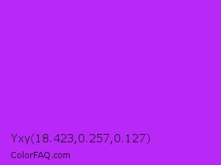 Yxy 18.423,0.257,0.127 Color is a normal purple color and the nearest color is Veronica #a020f0. Hex code #b828f7 and RGB value is rgb(184,40,247). In RGB color space, this color is composed of 72% red, 16% green, 97% blue, In CMYK color space, this color is composed of 26% cyan, 84% magenta, 0% yellow , 3% black , In HSL color space, this color has a hue angle of 282° , 93% saturation and 56% lightness.
