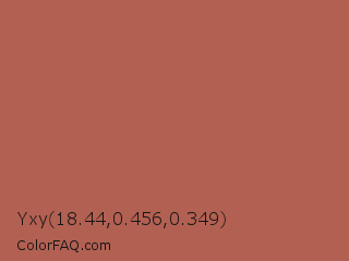 Yxy 18.44,0.456,0.349 Color is a normal red color and the nearest color is Matrix #b05d54. Hex code #b26052 and RGB value is rgb(178,96,82). In RGB color space, this color is composed of 70% red, 38% green, 32% blue, In CMYK color space, this color is composed of 0% cyan, 46% magenta, 54% yellow , 30% black , In HSL color space, this color has a hue angle of 9° , 38% saturation and 51% lightness.