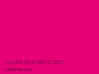 Yxy 18.44,0.497,0.251 Color is a normal rose color and the nearest color is Red Purple #e40078. Hex code #e80075 and RGB value is rgb(232,0,117). In RGB color space, this color is composed of 91% red, 0% green, 46% blue, In CMYK color space, this color is composed of 0% cyan, 100% magenta, 50% yellow , 9% black , In HSL color space, this color has a hue angle of 330° , 100% saturation and 45% lightness.