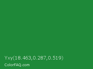 Yxy 18.463,0.287,0.519 Color is a normal green color and the nearest color is Forest Green #228b22. Hex code #1e8939 and RGB value is rgb(30,137,57). In RGB color space, this color is composed of 12% red, 54% green, 22% blue, In CMYK color space, this color is composed of 78% cyan, 0% magenta, 58% yellow , 46% black , In HSL color space, this color has a hue angle of 135° , 64% saturation and 33% lightness.