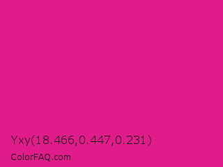 Yxy 18.466,0.447,0.231 Color is a normal magenta color and the nearest color is Barbie Pink #e0218a. Hex code #e01b8a and RGB value is rgb(224,27,138). In RGB color space, this color is composed of 88% red, 11% green, 54% blue, In CMYK color space, this color is composed of 0% cyan, 88% magenta, 38% yellow , 12% black , In HSL color space, this color has a hue angle of 326° , 78% saturation and 49% lightness.