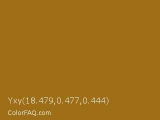 Yxy 18.479,0.477,0.444 Color is a normal orange color and the nearest color is Sand Dune #967117. Hex code #9e6e16 and RGB value is rgb(158,110,22). In RGB color space, this color is composed of 62% red, 43% green, 9% blue, In CMYK color space, this color is composed of 0% cyan, 30% magenta, 86% yellow , 38% black , In HSL color space, this color has a hue angle of 39° , 76% saturation and 35% lightness.