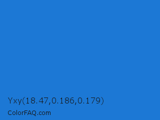 Yxy 18.47,0.186,0.179 Color is a normal blue color and the nearest color is Bright Navy Blue #1974d2. Hex code #1c78d5 and RGB value is rgb(28,120,213). In RGB color space, this color is composed of 11% red, 47% green, 84% blue, In CMYK color space, this color is composed of 87% cyan, 44% magenta, 0% yellow , 16% black , In HSL color space, this color has a hue angle of 210° , 77% saturation and 47% lightness.