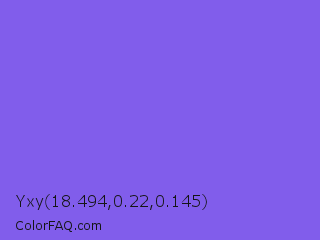Yxy 18.494,0.22,0.145 Color is a light indigo color and the nearest color is Medium Slate Blue #7b68ee. Hex code #815deb and RGB value is rgb(129,93,235). In RGB color space, this color is composed of 51% red, 36% green, 92% blue, In CMYK color space, this color is composed of 45% cyan, 60% magenta, 0% yellow , 8% black , In HSL color space, this color has a hue angle of 255° , 78% saturation and 64% lightness.