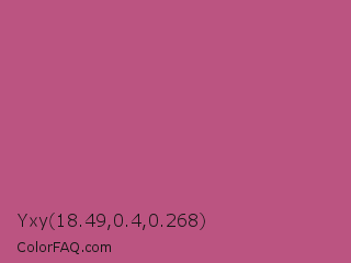 Yxy 18.49,0.4,0.268 Color is a normal rose color and the nearest color is Tapestry #b05e81. Hex code #bb5481 and RGB value is rgb(187,84,129). In RGB color space, this color is composed of 73% red, 33% green, 51% blue, In CMYK color space, this color is composed of 0% cyan, 55% magenta, 31% yellow , 27% black , In HSL color space, this color has a hue angle of 334° , 43% saturation and 53% lightness.