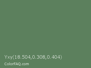 Yxy 18.504,0.308,0.404 Color is a normal green color and the nearest color is Glade Green #61845f. Hex code #5c805d and RGB value is rgb(92,128,93). In RGB color space, this color is composed of 36% red, 50% green, 36% blue, In CMYK color space, this color is composed of 28% cyan, 0% magenta, 27% yellow , 50% black , In HSL color space, this color has a hue angle of 122° , 16% saturation and 43% lightness.