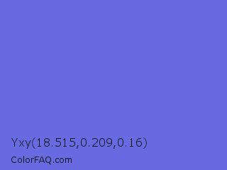 Yxy 18.515,0.209,0.16 Color is a light blue color and the nearest color is Medium Slate Blue #7b68ee. Hex code #676ae0 and RGB value is rgb(103,106,224). In RGB color space, this color is composed of 40% red, 42% green, 88% blue, In CMYK color space, this color is composed of 54% cyan, 53% magenta, 0% yellow , 12% black , In HSL color space, this color has a hue angle of 239° , 66% saturation and 64% lightness.