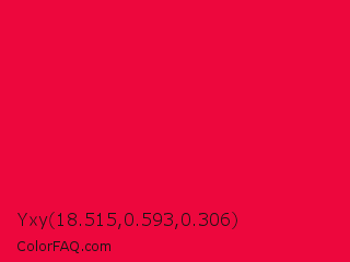 Yxy 18.515,0.593,0.306 Color is a normal red color and the nearest color is Red Ribbon #ed0a3f. Hex code #ed073d and RGB value is rgb(237,7,61). In RGB color space, this color is composed of 93% red, 3% green, 24% blue, In CMYK color space, this color is composed of 0% cyan, 97% magenta, 74% yellow , 7% black , In HSL color space, this color has a hue angle of 346° , 94% saturation and 48% lightness.