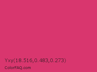Yxy 18.516,0.483,0.273 Color is a normal rose color and the nearest color is Telemagenta #cf3476. Hex code #d9366e and RGB value is rgb(217,54,110). In RGB color space, this color is composed of 85% red, 21% green, 43% blue, In CMYK color space, this color is composed of 0% cyan, 75% magenta, 49% yellow , 15% black , In HSL color space, this color has a hue angle of 339° , 68% saturation and 53% lightness.