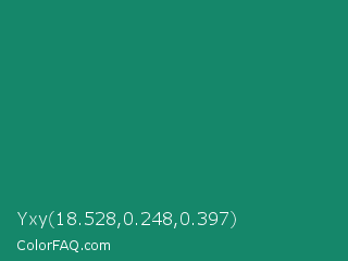 Yxy 18.528,0.248,0.397 Color is a normal cyan color and the nearest color is Elf Green #088370. Hex code #15876a and RGB value is rgb(21,135,106). In RGB color space, this color is composed of 8% red, 53% green, 42% blue, In CMYK color space, this color is composed of 84% cyan, 0% magenta, 21% yellow , 47% black , In HSL color space, this color has a hue angle of 165° , 73% saturation and 31% lightness.