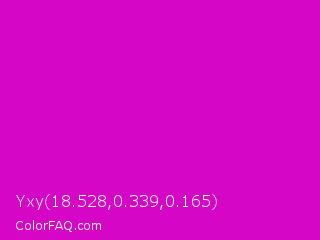 Yxy 18.528,0.339,0.165 Color is a normal magenta color and the nearest color is Deep Magenta #cc00cc. Hex code #d606c7 and RGB value is rgb(214,6,199). In RGB color space, this color is composed of 84% red, 2% green, 78% blue, In CMYK color space, this color is composed of 0% cyan, 97% magenta, 7% yellow , 16% black , In HSL color space, this color has a hue angle of 304° , 95% saturation and 43% lightness.