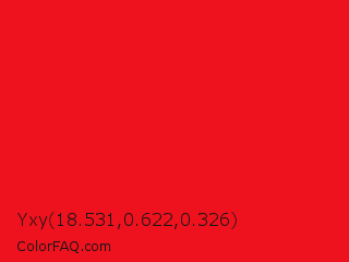 Yxy 18.531,0.622,0.326 Color is a normal red color and the nearest color is Red Pigment #ed1c24. Hex code #ed121e and RGB value is rgb(237,18,30). In RGB color space, this color is composed of 93% red, 7% green, 12% blue, In CMYK color space, this color is composed of 0% cyan, 92% magenta, 87% yellow , 7% black , In HSL color space, this color has a hue angle of 357° , 86% saturation and 50% lightness.