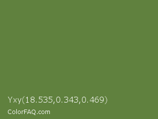 Yxy 18.535,0.343,0.469 Color is a normal green color and the nearest color is Dingley #5d7747. Hex code #60813e and RGB value is rgb(96,129,62). In RGB color space, this color is composed of 38% red, 51% green, 24% blue, In CMYK color space, this color is composed of 26% cyan, 0% magenta, 52% yellow , 49% black , In HSL color space, this color has a hue angle of 90° , 35% saturation and 37% lightness.