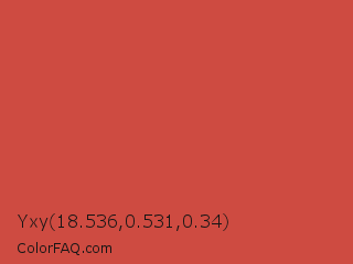 Yxy 18.536,0.531,0.34 Color is a normal red color and the nearest color is English Vermillion #cc474b. Hex code #ce4b41 and RGB value is rgb(206,75,65). In RGB color space, this color is composed of 81% red, 29% green, 25% blue, In CMYK color space, this color is composed of 0% cyan, 64% magenta, 68% yellow , 19% black , In HSL color space, this color has a hue angle of 4° , 59% saturation and 53% lightness.