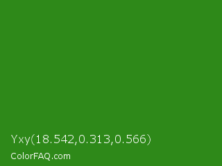 Yxy 18.542,0.313,0.566 Color is a normal green color and the nearest color is La Palma #368716. Hex code #2e8919 and RGB value is rgb(46,137,25). In RGB color space, this color is composed of 18% red, 54% green, 10% blue, In CMYK color space, this color is composed of 66% cyan, 0% magenta, 82% yellow , 46% black , In HSL color space, this color has a hue angle of 109° , 69% saturation and 32% lightness.