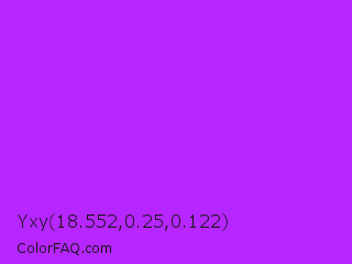 Yxy 18.552,0.25,0.122 Color is a normal purple color and the nearest color is Veronica #a020f0. Hex code #b626fe and RGB value is rgb(182,38,254). In RGB color space, this color is composed of 71% red, 15% green, 100% blue, In CMYK color space, this color is composed of 28% cyan, 85% magenta, 0% yellow , 0% black , In HSL color space, this color has a hue angle of 280° , 99% saturation and 57% lightness.