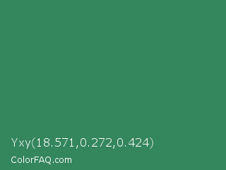 Yxy 18.571,0.272,0.424 Color is a normal green color and the nearest color is Sea Green #2e8b57. Hex code #34865d and RGB value is rgb(52,134,93). In RGB color space, this color is composed of 20% red, 53% green, 36% blue, In CMYK color space, this color is composed of 61% cyan, 0% magenta, 31% yellow , 47% black , In HSL color space, this color has a hue angle of 150° , 44% saturation and 36% lightness.