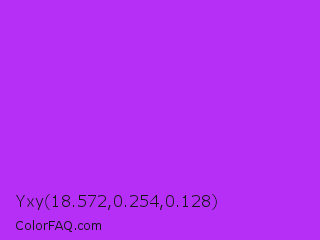 Yxy 18.572,0.254,0.128 Color is a normal purple color and the nearest color is Veronica #a020f0. Hex code #b52ff7 and RGB value is rgb(181,47,247). In RGB color space, this color is composed of 71% red, 18% green, 97% blue, In CMYK color space, this color is composed of 27% cyan, 81% magenta, 0% yellow , 3% black , In HSL color space, this color has a hue angle of 280° , 93% saturation and 58% lightness.