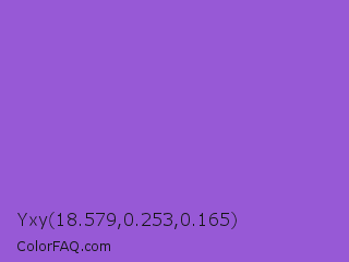 Yxy 18.579,0.253,0.165 Color is a normal violet color and the nearest color is Amethyst #9966cc. Hex code #9759d6 and RGB value is rgb(151,89,214). In RGB color space, this color is composed of 59% red, 35% green, 84% blue, In CMYK color space, this color is composed of 29% cyan, 58% magenta, 0% yellow , 16% black , In HSL color space, this color has a hue angle of 270° , 60% saturation and 59% lightness.