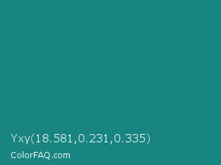 Yxy 18.581,0.231,0.335 Color is a normal cyan color and the nearest color is Elm #1c7c7d. Hex code #198582 and RGB value is rgb(25,133,130). In RGB color space, this color is composed of 10% red, 52% green, 51% blue, In CMYK color space, this color is composed of 81% cyan, 0% magenta, 2% yellow , 48% black , In HSL color space, this color has a hue angle of 178° , 68% saturation and 31% lightness.