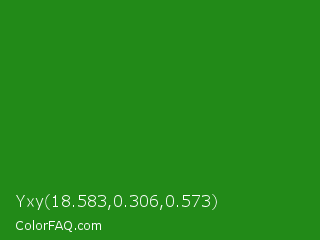 Yxy 18.583,0.306,0.573 Color is a normal green color and the nearest color is Forest Green #228b22. Hex code #228a18 and RGB value is rgb(34,138,24). In RGB color space, this color is composed of 13% red, 54% green, 9% blue, In CMYK color space, this color is composed of 75% cyan, 0% magenta, 83% yellow , 46% black , In HSL color space, this color has a hue angle of 115° , 70% saturation and 32% lightness.