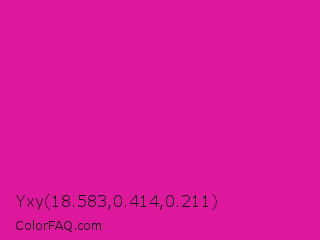 Yxy 18.583,0.414,0.211 Color is a normal magenta color and the nearest color is Barbie Pink #e0218a. Hex code #de189c and RGB value is rgb(222,24,156). In RGB color space, this color is composed of 87% red, 9% green, 61% blue, In CMYK color space, this color is composed of 0% cyan, 89% magenta, 30% yellow , 13% black , In HSL color space, this color has a hue angle of 320° , 80% saturation and 48% lightness.