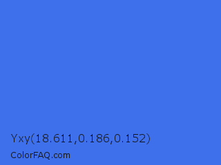 Yxy 18.611,0.186,0.152 Color is a normal blue color and the nearest color is Royal Blue #4169e1. Hex code #3e70eb and RGB value is rgb(62,112,235). In RGB color space, this color is composed of 24% red, 44% green, 92% blue, In CMYK color space, this color is composed of 74% cyan, 52% magenta, 0% yellow , 8% black , In HSL color space, this color has a hue angle of 223° , 81% saturation and 58% lightness.