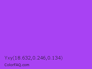 Yxy 18.632,0.246,0.134 Color is a light purple color and the nearest color is Navy Purple #9457eb. Hex code #a842f3 and RGB value is rgb(168,66,243). In RGB color space, this color is composed of 66% red, 26% green, 95% blue, In CMYK color space, this color is composed of 31% cyan, 73% magenta, 0% yellow , 5% black , In HSL color space, this color has a hue angle of 275° , 88% saturation and 61% lightness.
