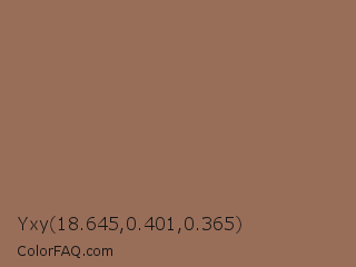 Yxy 18.645,0.401,0.365 Color is a normal orange color and the nearest color is Leather #967059. Hex code #996e59 and RGB value is rgb(153,110,89). In RGB color space, this color is composed of 60% red, 43% green, 35% blue, In CMYK color space, this color is composed of 0% cyan, 28% magenta, 42% yellow , 40% black , In HSL color space, this color has a hue angle of 20° , 26% saturation and 47% lightness.