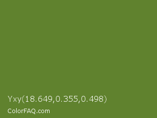 Yxy 18.649,0.355,0.498 Color is a normal green color and the nearest color is Maximum Green #5e8c31. Hex code #60822e and RGB value is rgb(96,130,46). In RGB color space, this color is composed of 38% red, 51% green, 18% blue, In CMYK color space, this color is composed of 26% cyan, 0% magenta, 65% yellow , 49% black , In HSL color space, this color has a hue angle of 84° , 48% saturation and 35% lightness.