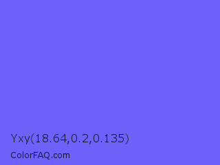 Yxy 18.64,0.2,0.135 Color is a light indigo color and the nearest color is Very Light Blue #6666ff. Hex code #6c61f9 and RGB value is rgb(108,97,249). In RGB color space, this color is composed of 42% red, 38% green, 98% blue, In CMYK color space, this color is composed of 57% cyan, 61% magenta, 0% yellow , 2% black , In HSL color space, this color has a hue angle of 244° , 93% saturation and 68% lightness.
