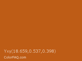 Yxy 18.659,0.537,0.398 Color is a normal orange color and the nearest color is Orange Roughy #c45719. Hex code #be5c16 and RGB value is rgb(190,92,22). In RGB color space, this color is composed of 75% red, 36% green, 9% blue, In CMYK color space, this color is composed of 0% cyan, 52% magenta, 88% yellow , 25% black , In HSL color space, this color has a hue angle of 25° , 79% saturation and 42% lightness.