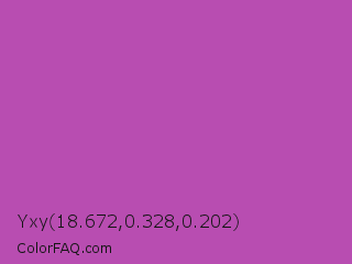 Yxy 18.672,0.328,0.202 Color is a normal magenta color and the nearest color is Fuchsia Pink #c154c1. Hex code #b84db1 and RGB value is rgb(184,77,177). In RGB color space, this color is composed of 72% red, 30% green, 69% blue, In CMYK color space, this color is composed of 0% cyan, 58% magenta, 4% yellow , 28% black , In HSL color space, this color has a hue angle of 304° , 43% saturation and 51% lightness.