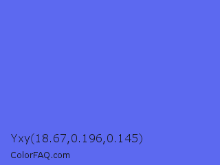 Yxy 18.67,0.196,0.145 Color is a light blue color and the nearest color is Very Light Blue #6666ff. Hex code #5c69f0 and RGB value is rgb(92,105,240). In RGB color space, this color is composed of 36% red, 41% green, 94% blue, In CMYK color space, this color is composed of 62% cyan, 56% magenta, 0% yellow , 6% black , In HSL color space, this color has a hue angle of 235° , 83% saturation and 65% lightness.