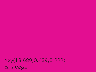 Yxy 18.689,0.439,0.222 Color is a normal magenta color and the nearest color is Barbie Pink #e0218a. Hex code #e30e91 and RGB value is rgb(227,14,145). In RGB color space, this color is composed of 89% red, 5% green, 57% blue, In CMYK color space, this color is composed of 0% cyan, 94% magenta, 36% yellow , 11% black , In HSL color space, this color has a hue angle of 323° , 88% saturation and 47% lightness.