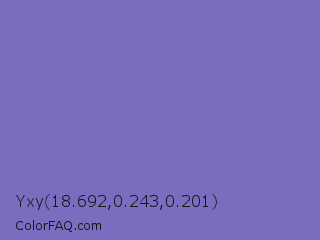 Yxy 18.692,0.243,0.201 Color is a normal indigo color and the nearest color is Toolbox #746cc0. Hex code #786dbf and RGB value is rgb(120,109,191). In RGB color space, this color is composed of 47% red, 43% green, 75% blue, In CMYK color space, this color is composed of 37% cyan, 43% magenta, 0% yellow , 25% black , In HSL color space, this color has a hue angle of 248° , 39% saturation and 59% lightness.