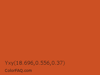 Yxy 18.696,0.556,0.37 Color is a normal orange color and the nearest color is Orange Roughy #c45719. Hex code #cc5023 and RGB value is rgb(204,80,35). In RGB color space, this color is composed of 80% red, 31% green, 14% blue, In CMYK color space, this color is composed of 0% cyan, 61% magenta, 83% yellow , 20% black , In HSL color space, this color has a hue angle of 16° , 71% saturation and 47% lightness.