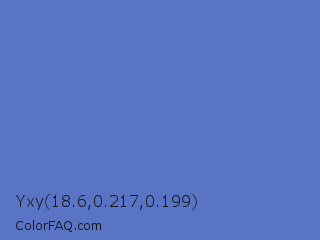 Yxy 18.6,0.217,0.199 Color is a normal blue color and the nearest color is Indigo #4f69c6. Hex code #5974c4 and RGB value is rgb(89,116,196). In RGB color space, this color is composed of 35% red, 45% green, 77% blue, In CMYK color space, this color is composed of 55% cyan, 41% magenta, 0% yellow , 23% black , In HSL color space, this color has a hue angle of 225° , 48% saturation and 56% lightness.