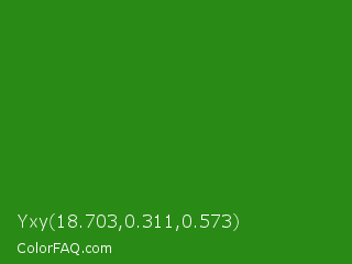 Yxy 18.703,0.311,0.573 Color is a normal green color and the nearest color is Slimy Green #299617. Hex code #298a15 and RGB value is rgb(41,138,21). In RGB color space, this color is composed of 16% red, 54% green, 8% blue, In CMYK color space, this color is composed of 70% cyan, 0% magenta, 85% yellow , 46% black , In HSL color space, this color has a hue angle of 110° , 74% saturation and 31% lightness.