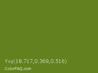 Yxy 18.717,0.369,0.516 Color is a normal lime color and the nearest color is Olive Drab #6b8e23. Hex code #63821f and RGB value is rgb(99,130,31). In RGB color space, this color is composed of 39% red, 51% green, 12% blue, In CMYK color space, this color is composed of 24% cyan, 0% magenta, 76% yellow , 49% black , In HSL color space, this color has a hue angle of 79° , 61% saturation and 32% lightness.