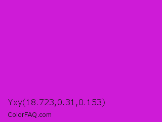 Yxy 18.723,0.31,0.153 Color is a normal magenta color and the nearest color is Steel Pink #cc33cc. Hex code #ce1bd7 and RGB value is rgb(206,27,215). In RGB color space, this color is composed of 81% red, 11% green, 84% blue, In CMYK color space, this color is composed of 4% cyan, 87% magenta, 0% yellow , 16% black , In HSL color space, this color has a hue angle of 297° , 78% saturation and 47% lightness.