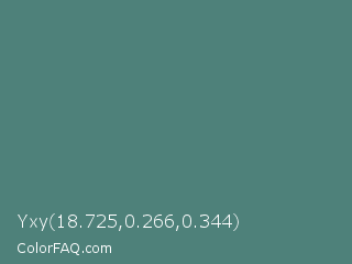 Yxy 18.725,0.266,0.344 Color is a normal cyan color and the nearest color is Wintergreen Dream #56887d. Hex code #4e817a and RGB value is rgb(78,129,122). In RGB color space, this color is composed of 31% red, 51% green, 48% blue, In CMYK color space, this color is composed of 40% cyan, 0% magenta, 5% yellow , 49% black , In HSL color space, this color has a hue angle of 172° , 25% saturation and 41% lightness.