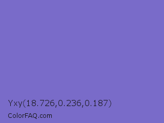 Yxy 18.726,0.236,0.187 Color is a normal indigo color and the nearest color is Blue Marguerite #7666c6. Hex code #796bc9 and RGB value is rgb(121,107,201). In RGB color space, this color is composed of 47% red, 42% green, 79% blue, In CMYK color space, this color is composed of 40% cyan, 47% magenta, 0% yellow , 21% black , In HSL color space, this color has a hue angle of 249° , 47% saturation and 60% lightness.