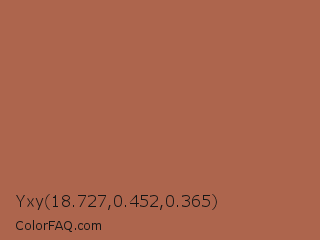 Yxy 18.727,0.452,0.365 Color is a normal color and the nearest color is Brown Sugar #af6e4d. Hex code #ad654d and RGB value is rgb(173,101,77). In RGB color space, this color is composed of 68% red, 40% green, 30% blue, In CMYK color space, this color is composed of 0% cyan, 42% magenta, 55% yellow , 32% black , In HSL color space, this color has a hue angle of 15° , 38% saturation and 49% lightness.